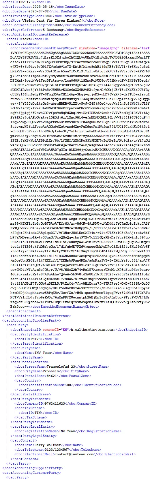 Er unterstützt die vollständige UBL und CII Struktur und damit alle Elemente, die in den 3 genannten E-Rechnungsformaten enthalten sein können, auch weit über die Norm EN 16931 hinaus.